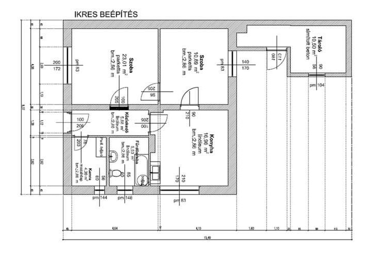 A lakórész alapterülete 67 m2 és tartozik hozzá egy tároló helyiség, amely az udvarról közelíthető meg, mérete: 10,5 m2.