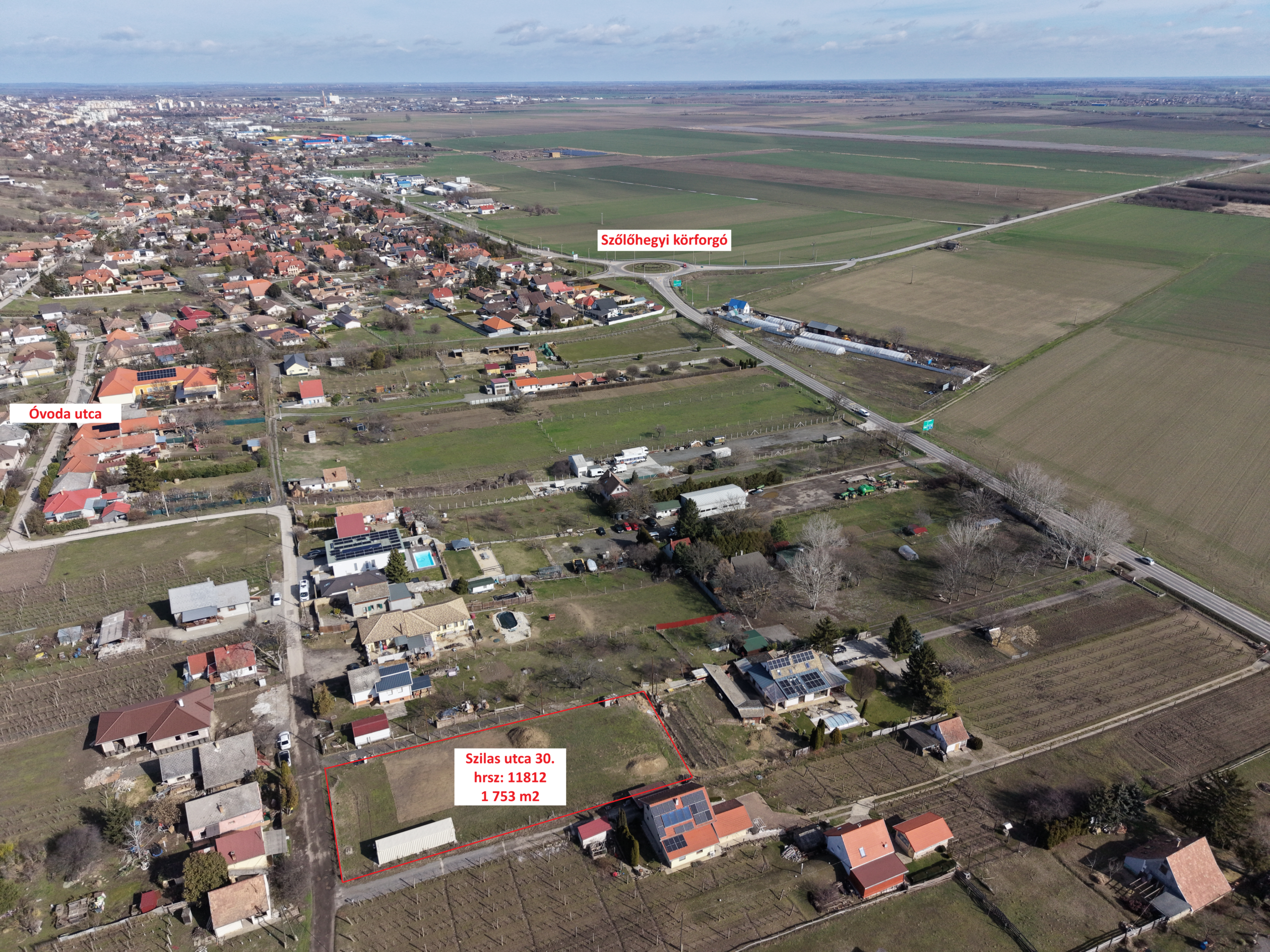A telek jól megközelíthető helyen fekszik: a Szőlőhegyi körforgó néhány percen belül elérhető, a buszmegálló kb. 300 méterre található, a közelben kisbolt, bölcsőde és óvoda is rendelkezésre áll. A telektől mintegy 10 méterre ér véget a szilárd burkolatú út, a telek előtt jelenleg murvás útszakasz található.